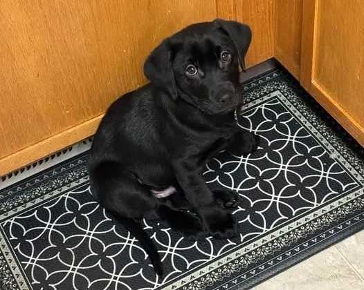 Un Aussiedor assis sur un tapis et regardant vers la caméra