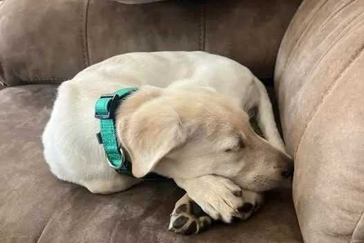 Un Aussiedor allongé sur un canapé et portant un collier autour du cou