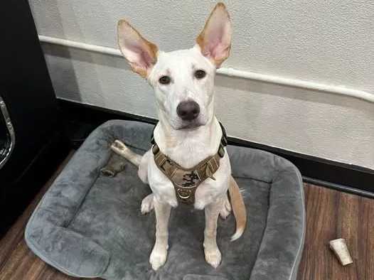 Un Aussiedor assis dans un panier et portant un harnais