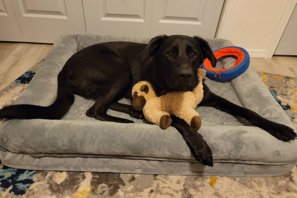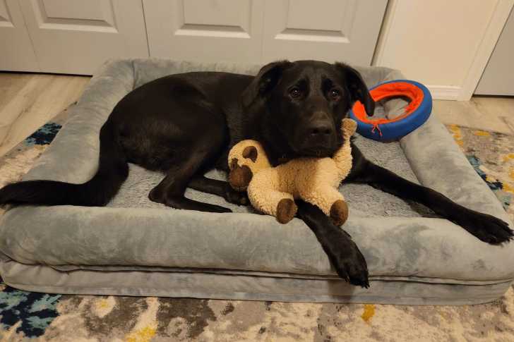 Un Aussiedor allongé sur un panier