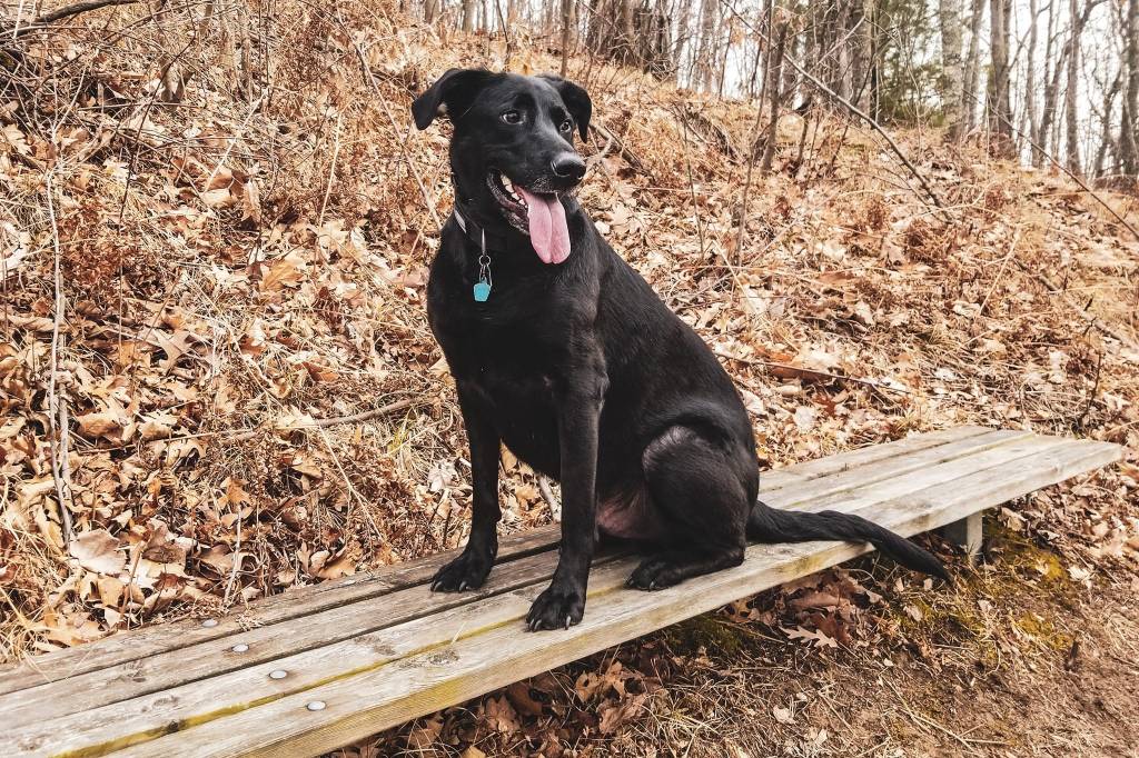 Un Aussiedor ayant la langue pendante et portant un collier autour du cou