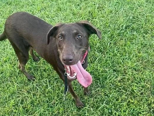 Un Aussiedor sur une surface gazonnée et ayant la langue pendante