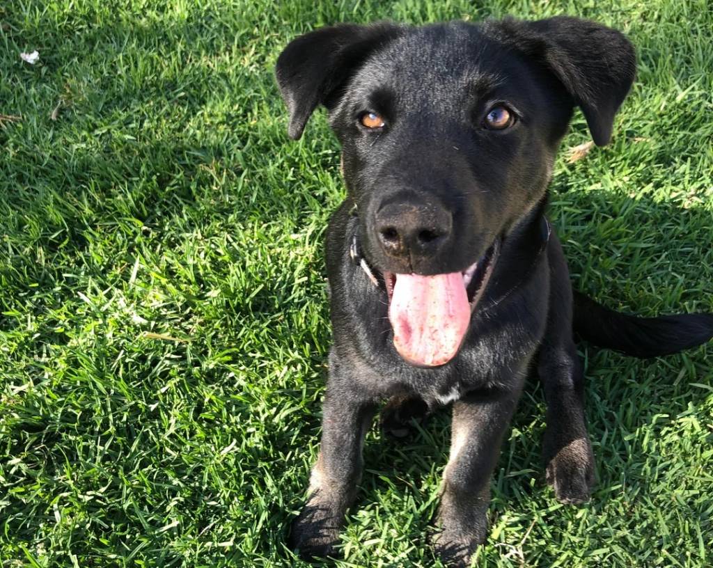 Un Aussiedor tirant la langue et portant un collier autour du cou