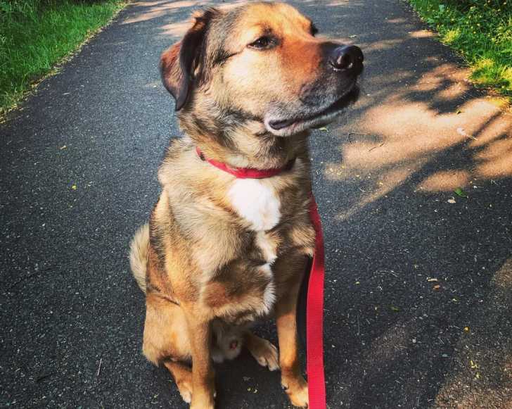 Un Aussiedor assis sur une surface bitumée et qui est tenu en laisse