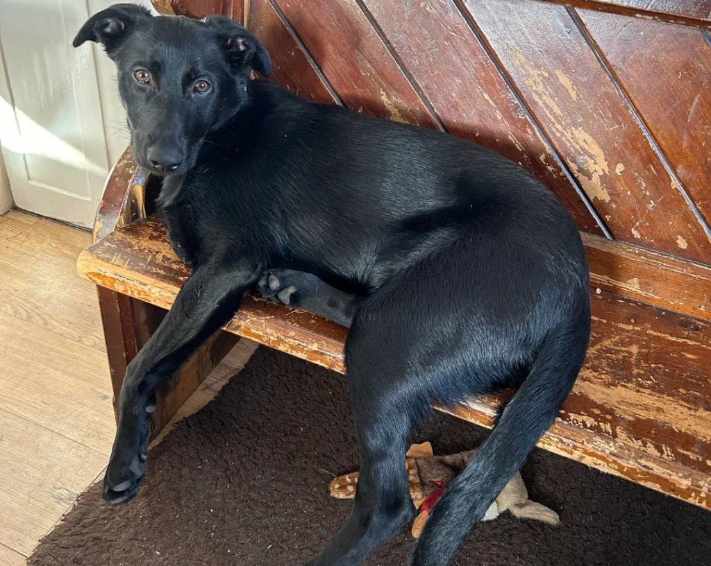Un Aussiedor allongé sur un banc en bois et regardant vers la caméra