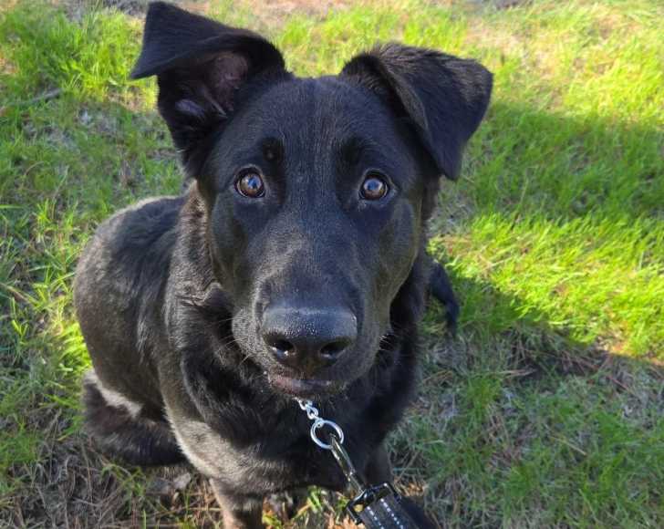 Un Aussiedor assis sur une surface gazonnée et qui est tenu en laisse