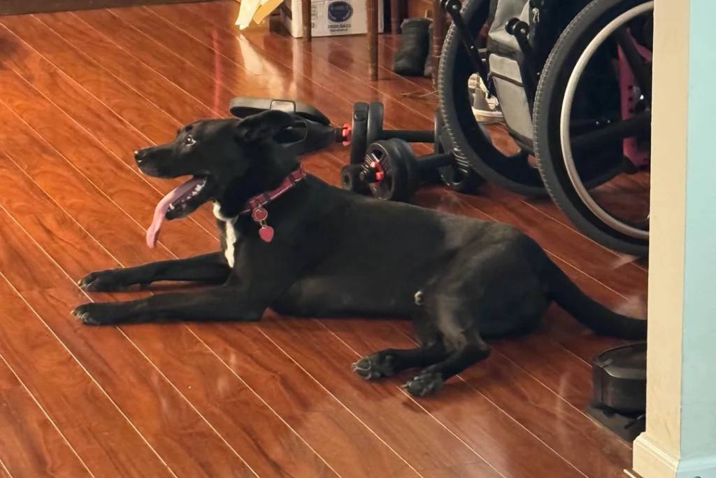 Un Aussiedor allongé sur un plancher et portant un collier autour du cou