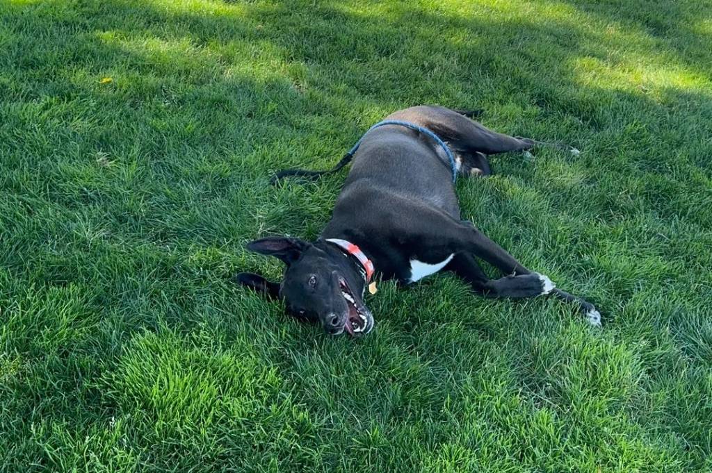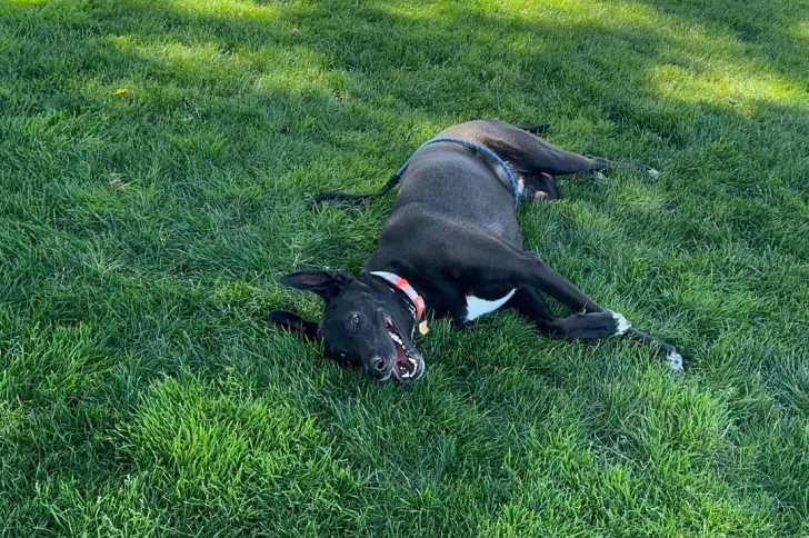 Un Aussiedor allongé sur une surface herbacée et portant un collier autour du cou