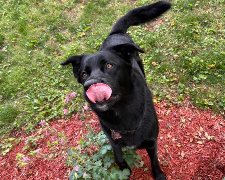 Un Aussiedor courant sur une surface herbacée et se léchant le museau