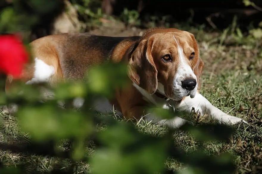 Un Bagle Hound au pelage bicolore, allongé sur une surface herbacée et portant un collier au cou