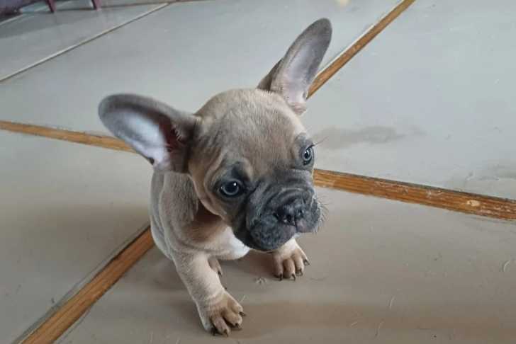 Un Bantam Bulldog assis sur un sol carrelé et semblant étendu