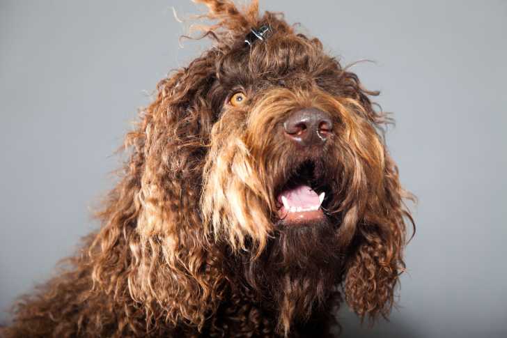 Un Barbet avec la gueule ouverte