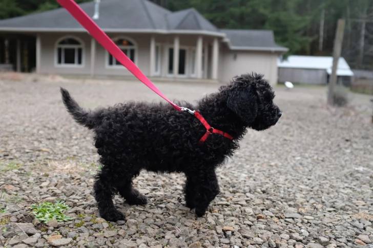 Un Barbet sur un terrain pierreux et tenu en laisse