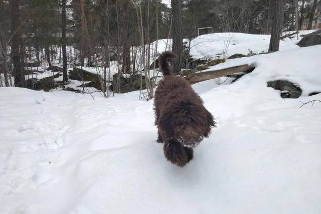 Un Barbet marchant sur une surface enneigée