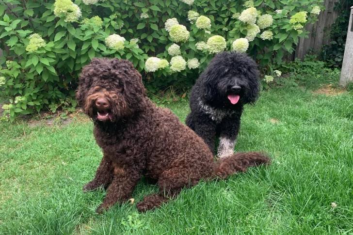 Deux Barbet assis sur un terrain herbeux