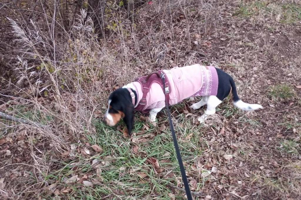 Un Basschshund sur un terrain herbeux et qui est tenu en laisse