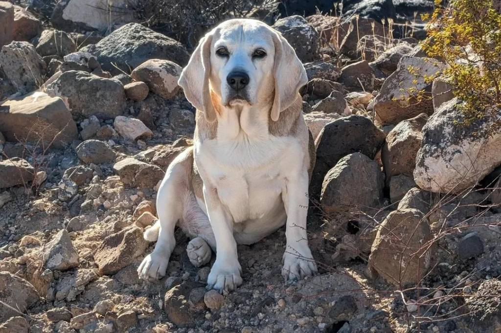 Un Basschshund assis sur une surface rocailleuse et regardant vers la caméra
