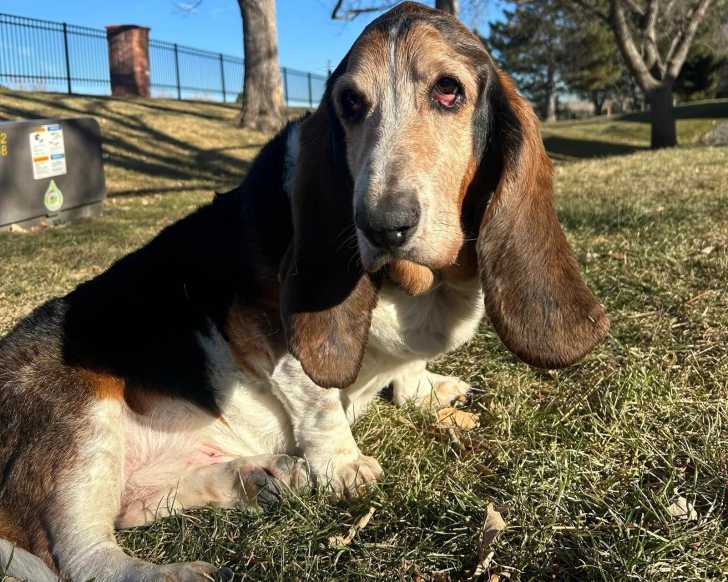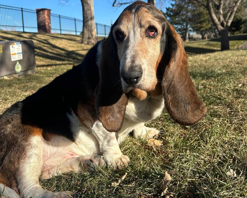 Un Basschshund assis sur un terrain herbeux et semblant détendu