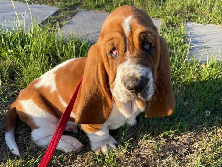 Un chiot Basschshund assis sur une surface herbacée et qui est tenu en laisse