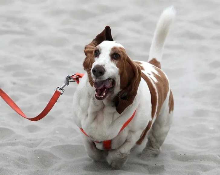 Un Basschshund courant sur une surface sableuse et qui est tenu en laisse