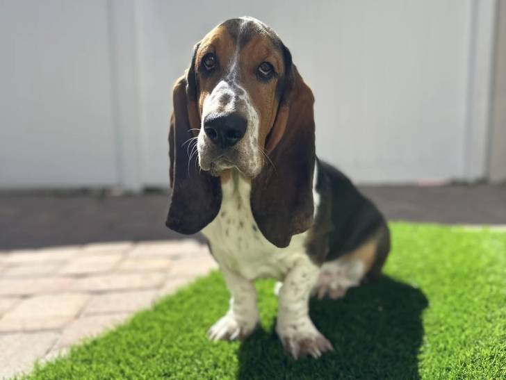 Un Basset Hound assis sur une surface gazonné