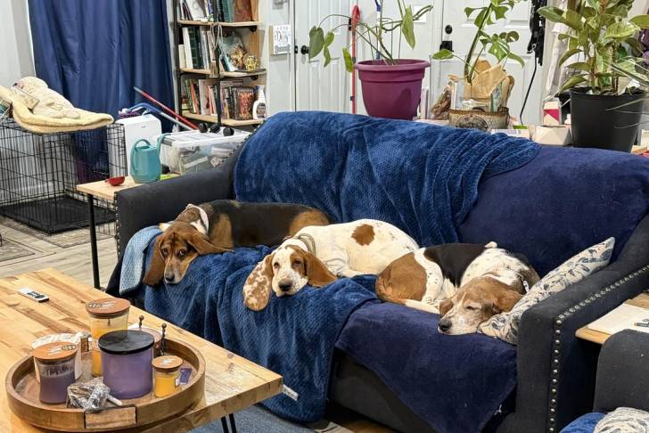 Trois Basset Hound allongés sur un canapé