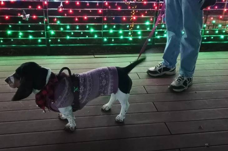 Un Basset Hound tenu en laisse et portant un manteau pour chien