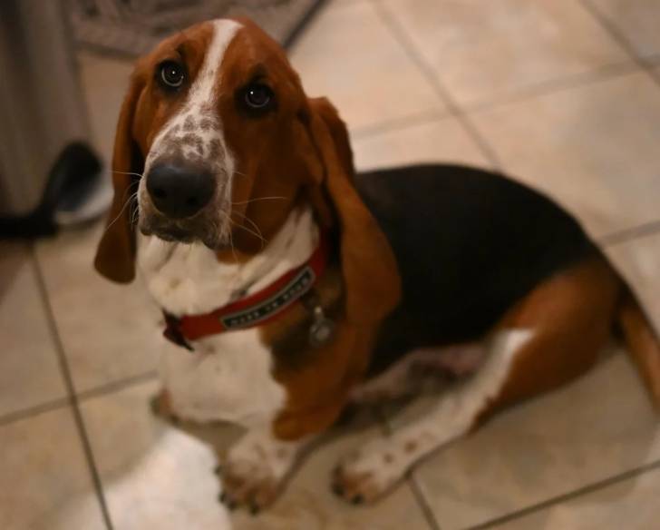 Un Basset Hound assis sur un sol carrelé et portant un collier autour du cou