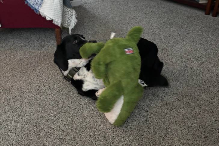 Un Basset Hound allongé sur une moquette et jouant avec une peluche