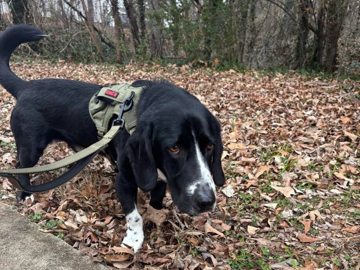 Un Basset Hound marchant sur un terrain herbeux et tenu en laisse