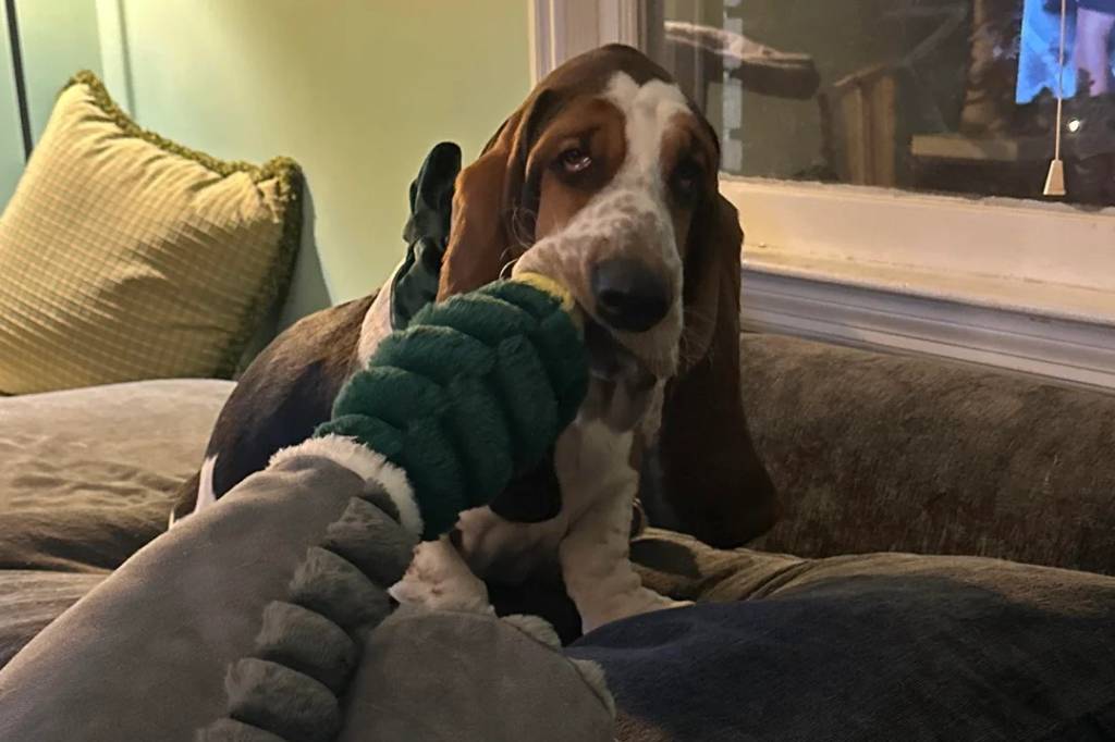Un Basset Hound sur un canapé et tirant une corde