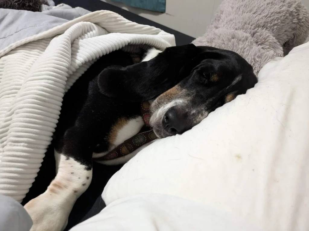 Un Basset Hound allongé sur un lit et semblant dormir