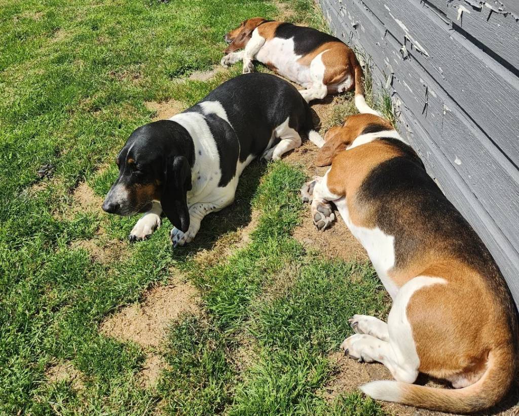 Trois Basset Hound allongés sur un terrain herbeux