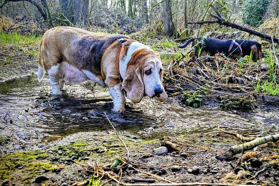 Un Basset Hound marchant dans l'eau