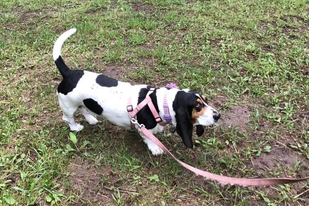 Un Basset Hound marchant sur un terrain herbeux