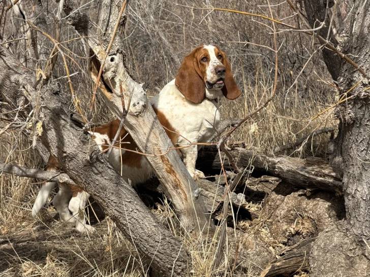 Un Basset Hound se tenant sur un arbre