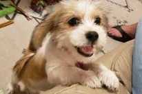 Un Bea-Tzu assis sur un tapis beige avec un jouet vert en arrière-plan