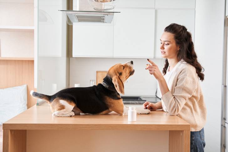 Un Beagle en train d'écouter sa propriétaire
