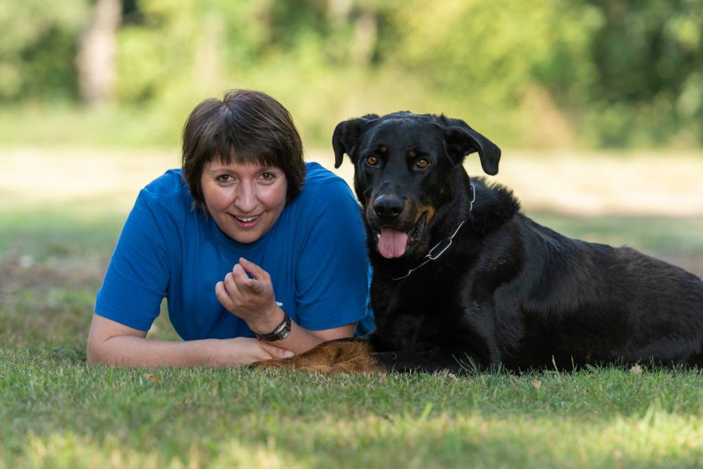Un Beauceron allongé dans l'herbe à côté de sa propriétaire