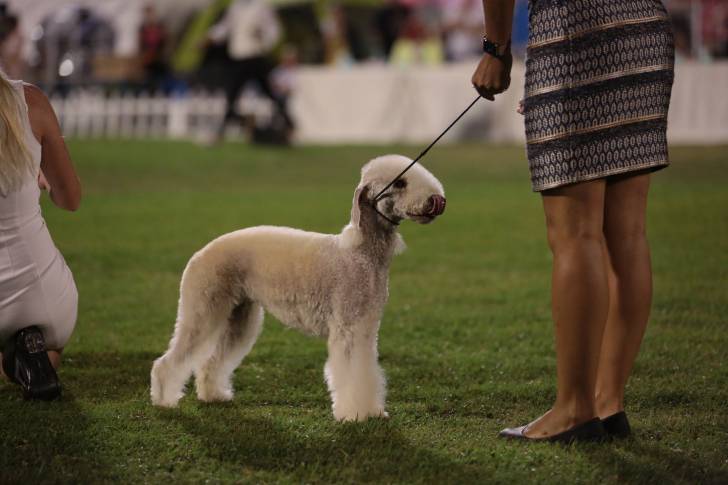 Toilettage d'un Bedlington Terrier avant une exposition canine