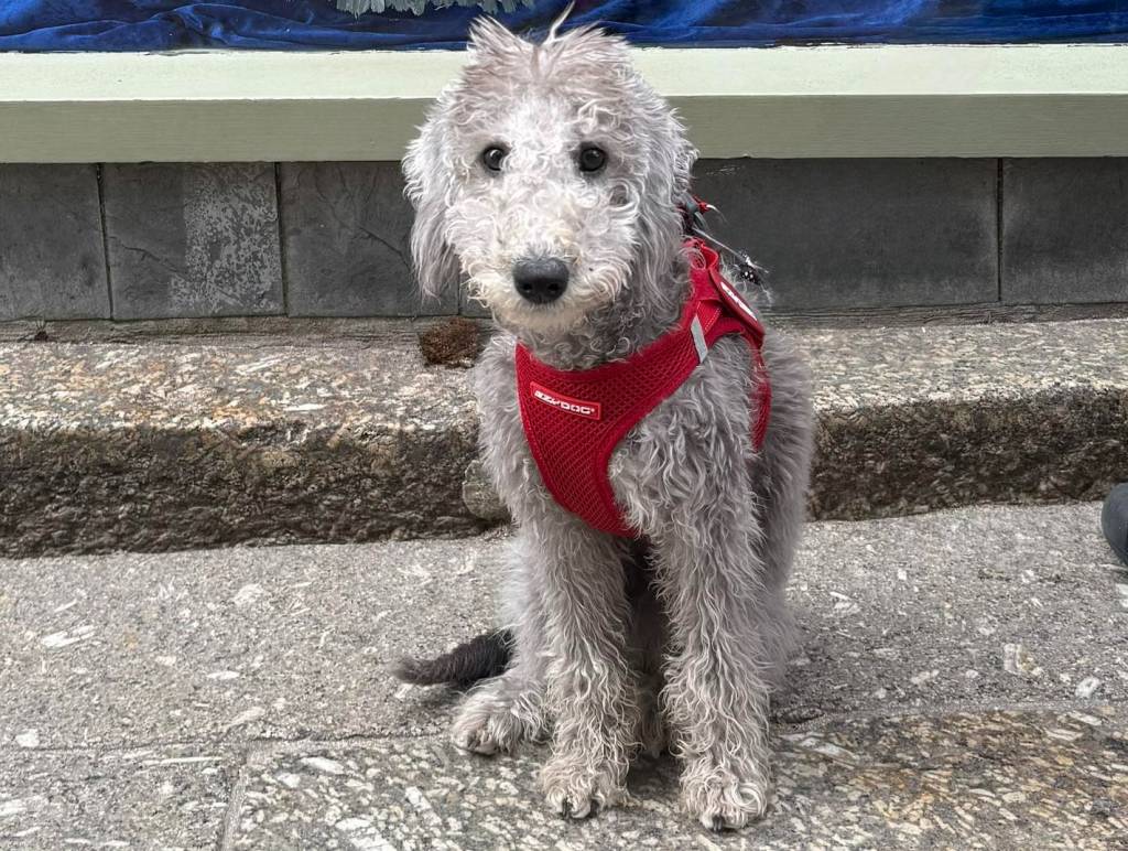 Un Bedlington Terrier assis sur une surface bétonnée et portant un harnais