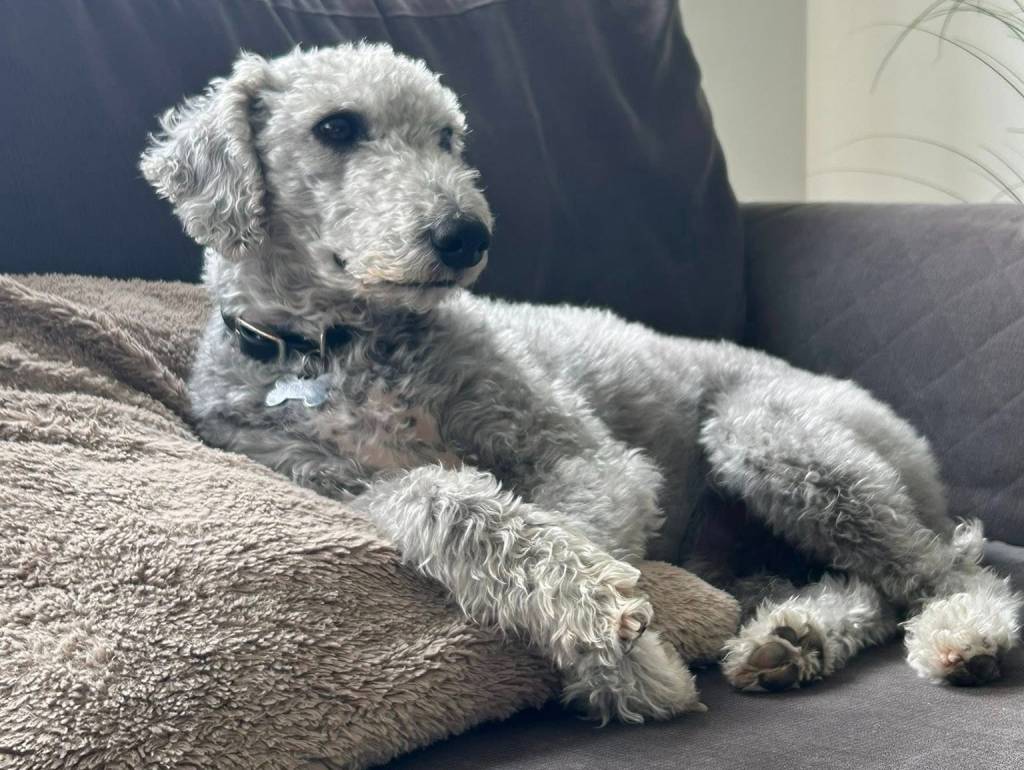 Un Bedlington Terrier allongé sur un canapé et portant un collier autour du cou