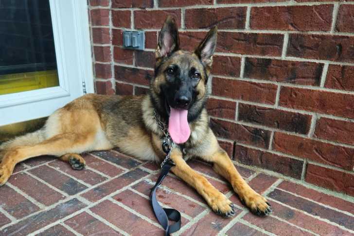 Un Belusky allongé devant une porte et tirant la langue