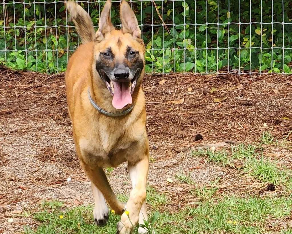 Un Belusky courant sur un terrain herbeux