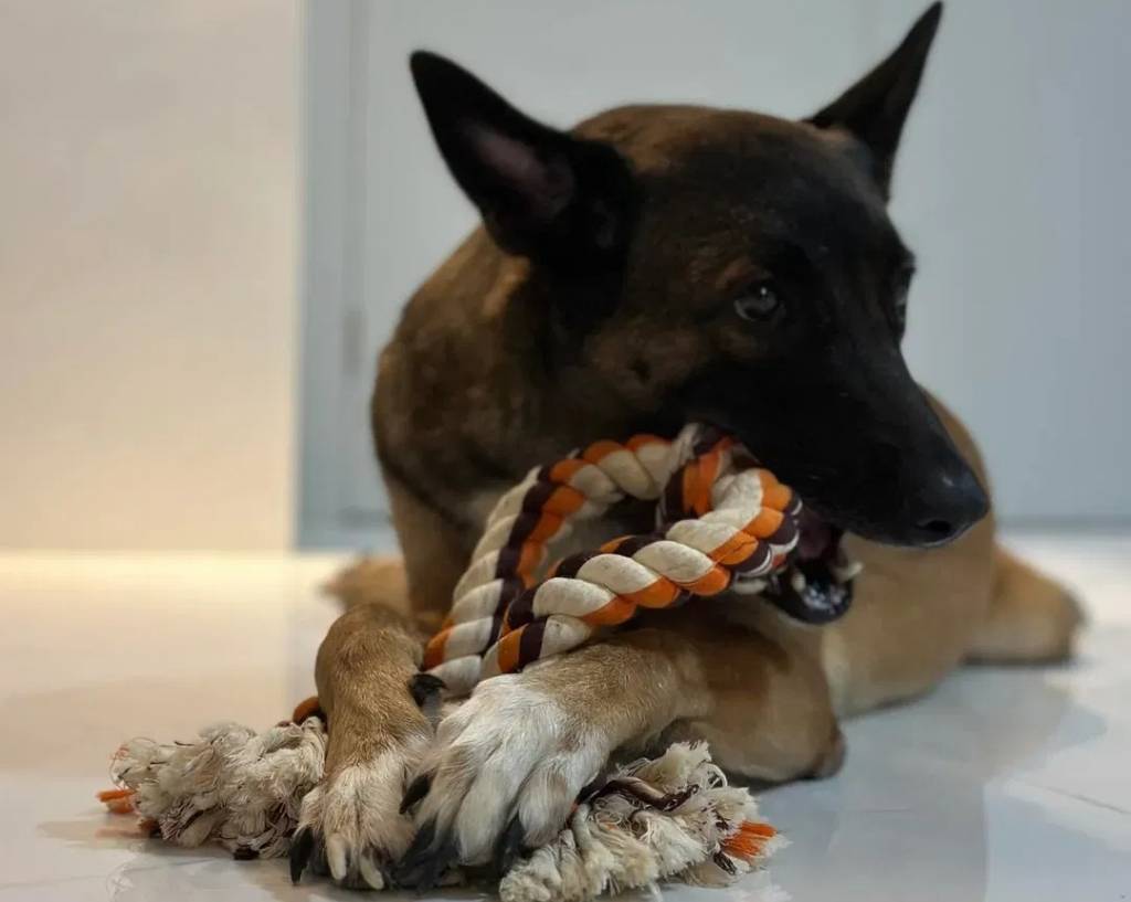 Un Belusky allongé sur un sol carrelé et mordant une corde