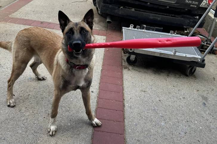 Un Belusky sur une surface bétonné et tenant un objet en plastique dans sa gueule
