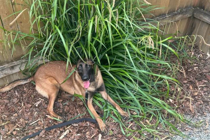 Un Belusky allongé dans un enclos et tirant la langue
