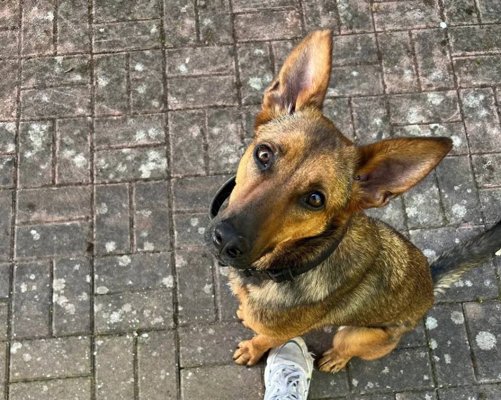 Un Belusky assis sur un sol carrelé et portant un collier autour du cou