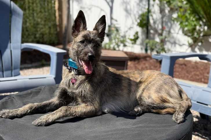 Un Belusky allongé sur une table et portant un collier autour du cou