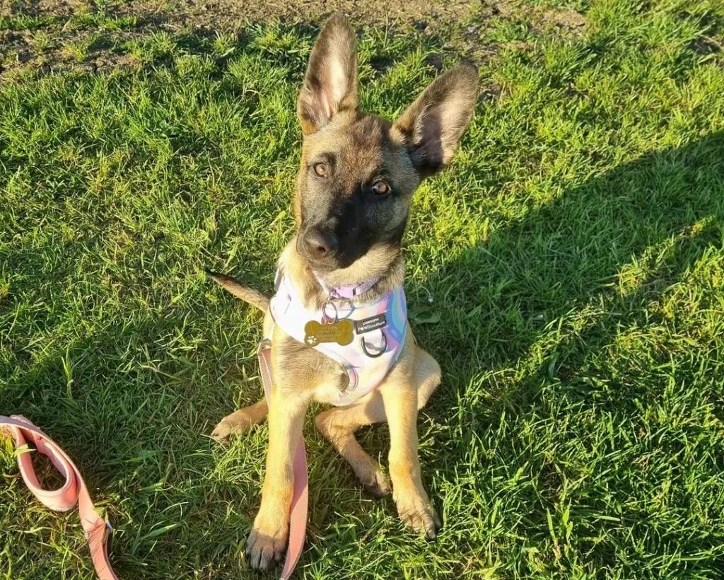 Un Belusky assis sur un terrain herbeux et portant un foulard autour du cou